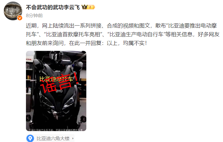 【大河财立方消息】5月6日,比亚迪集团品牌及公关处总经理李云飞在微博发文称,近期,网上陆续流出一系列拼接、合成的视频和图文,散布“比亚迪要推出电动摩托车”、“比亚迪首款摩托车亮相”、“比亚迪生产电动自行车”等相关信息,好多网友和朋友前来询问,在此一并回复:以上,均属不实!