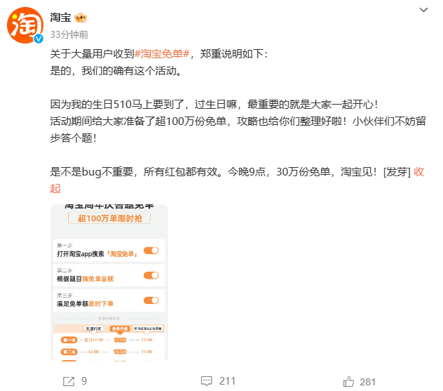淘宝称的确有这个活动,其文中提到“因为我的生日510马上要到了”“活动期间给大家准备了超100万份免单”。淘宝还表示:“是不是bug不重要,所有红包都有效”。