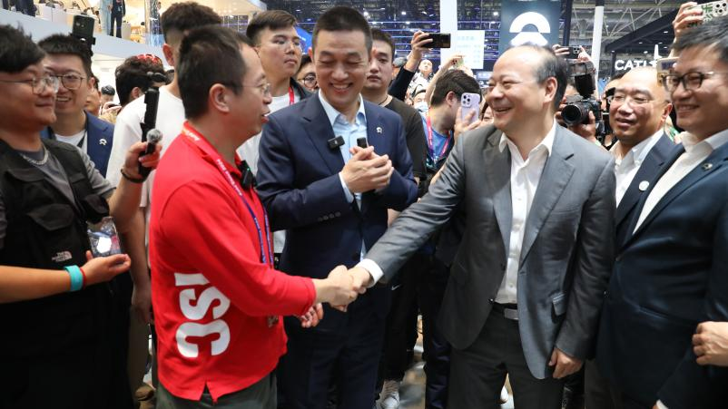 2024北京车展焦点“红衣大叔”周鸿祎和宁德时代董事长曾毓群互动。记者 史丽 摄