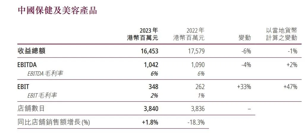 根据屈臣氏母公司长江和记发布的2023年年报,期内屈臣氏集团营收同比上涨8%至1833.44亿港元,EBITDA(税息折旧及摊销前利润)同比增长13%至162.26亿港元。
