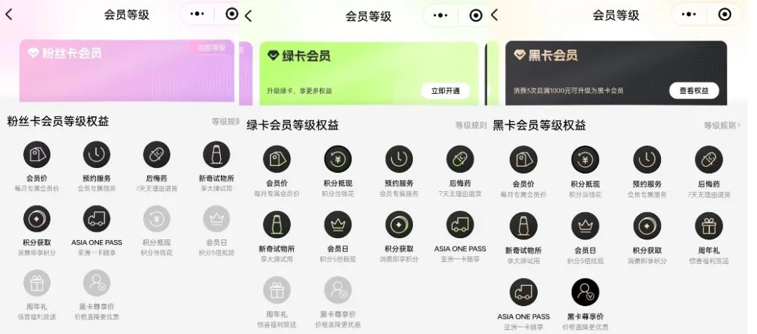 店员所说的35元付费会员卡,在小程序上显示为“绿卡会员”,比“粉丝卡会员”多出积分抵现和会员日两项权益。除此之外,绿卡会员在消费3次且满1000元时可升级为黑卡会员,能额外享受周年礼、黑卡尊享价等权益。