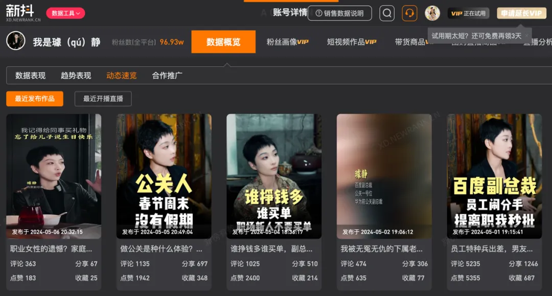 5月7日,《百度公关老大亲自下场做短视频,5天涨粉百万》的自媒体文章在网上传开,百度副总裁璩静开始走向大众视野。新抖数据显示,从5月1日起,璩静就在其名为“我是璩(qú)静”的个人抖音号中发布了第一条视频,随后又连发4条,至5月6日,总共发布5条视频,主要围绕职场话题分享自己的看法。