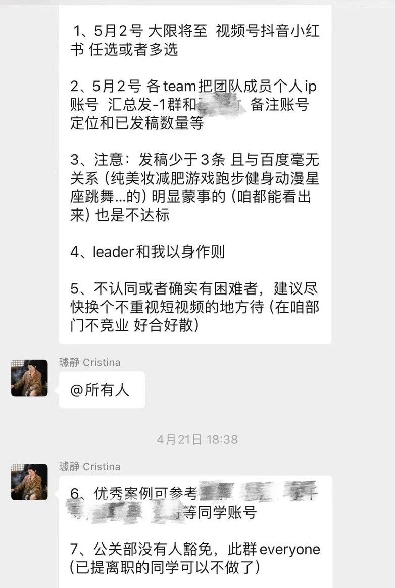 网络流传的一张截图显示,4月21日,璩静在工作群聊中表示:“5月2号大限将至,视频号抖音小红书,任选或者多选”,“发稿少于3条,且与百度毫无关系(纯美妆减肥游戏跑步健身动漫星座跳舞),明显蒙事的也是不达标”。她还同时表示,公关部无人可以豁免,“leader和我以身作则。不认同或者确实有困难者,建议尽快换个不重视短视频的地方待”。