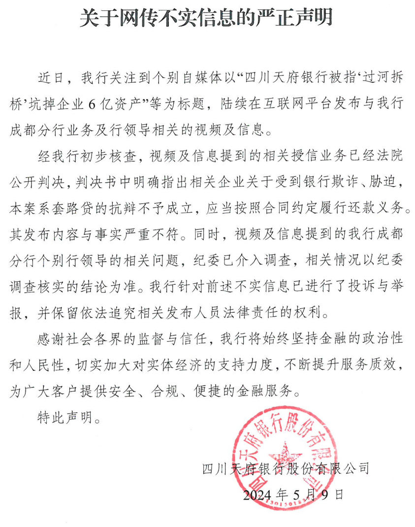 【大河财立方消息】5月9日,四川天府银行发布公告称,近日,该行关注到个别自媒体以“四川天府银行被指‘过河拆桥’坑掉企业6亿资产”等为标题,陆续在互联网平台发布与四川天府银行成都分行业务及行领导相关的视频及信息。