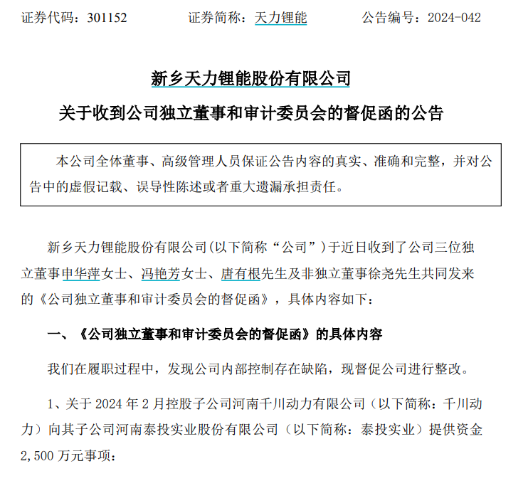 督促函提到,三名独董和一名董事在履职过程中,发现天力锂能内部控制存在缺陷,存在占用上市公司资金、进行期货投资、对外投资缺少尽调等问题,要求公司管理层于2024年5月中旬整改完毕,并向董事会报告。