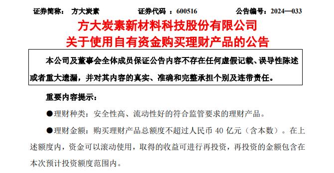 5月10日,方大炭素(600516)发布公告,公司及控股子公司拟使用自有资金购买安全性高、流动性好的理财产品。自股东大会审议通过之日起12个月内,购买理财产品额度不超过40亿元。