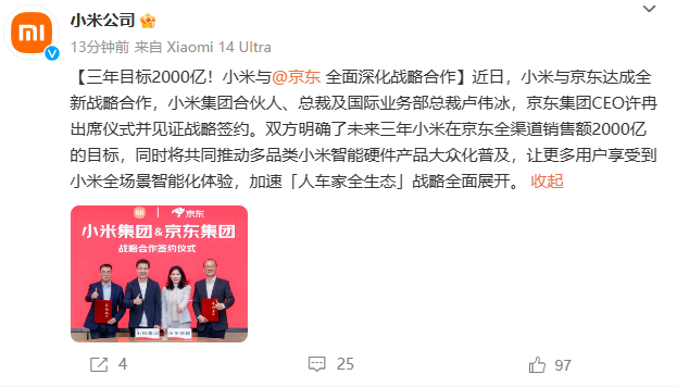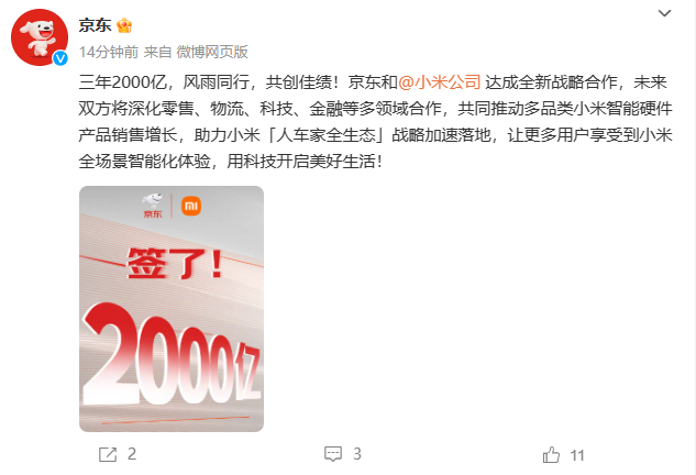 同日,京东也就此事在社交媒体上发文做出了回应。京东称和小米公司达成全新战略合作,未来双方将深化零售、物流、科技、金融等多领域合作,共同推动多品类小米智能硬件产品销售增长,助力小米“人车家全生态”战略加速落地,让更多用户享受到小米全场景智能化体验,用科技开启美好生活。