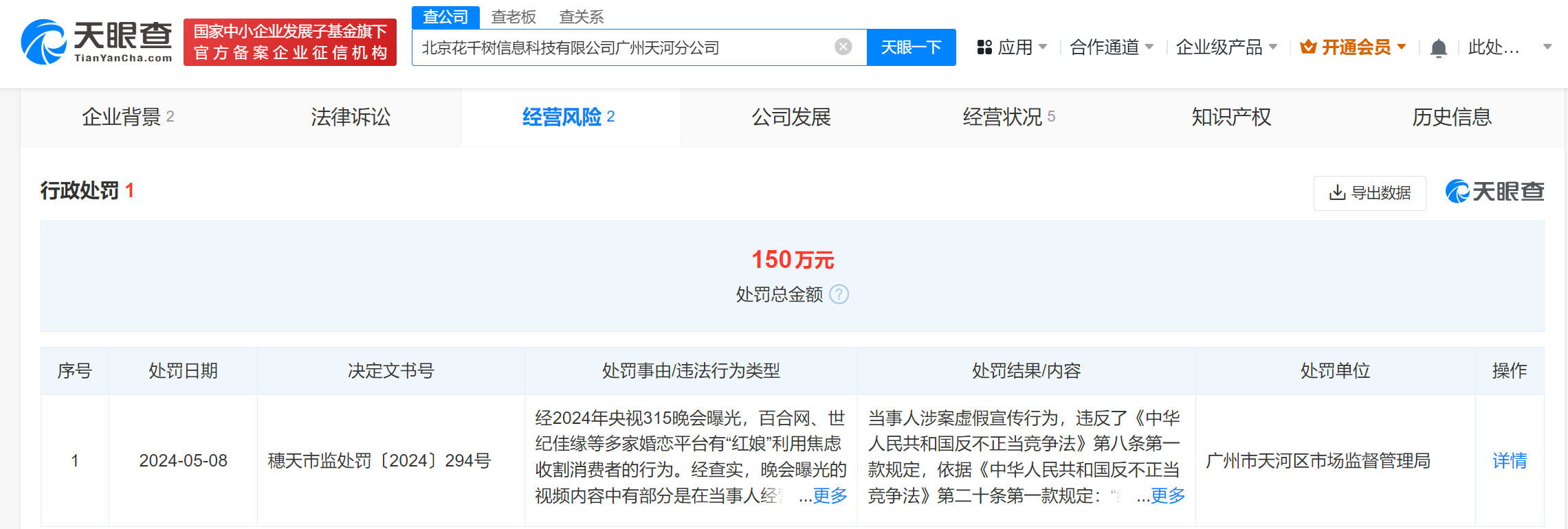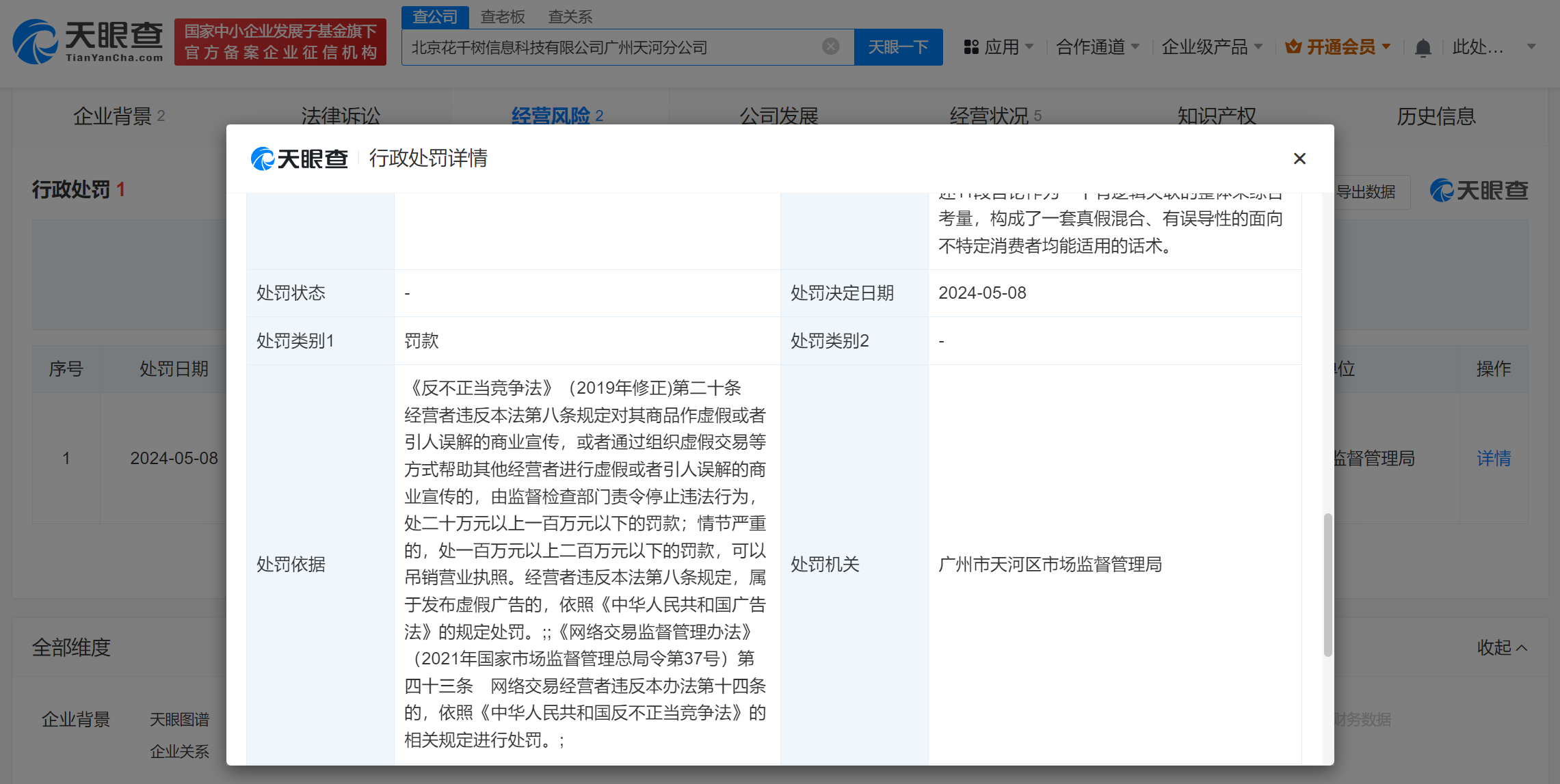 【大河财立方消息】天眼查经营风险信息显示,近日,北京花千树信息科技有限公司广州天河分公司因涉嫌虚假宣传,违反反不正当竞争法,被广州市天河区市场监督管理局罚款150万元。