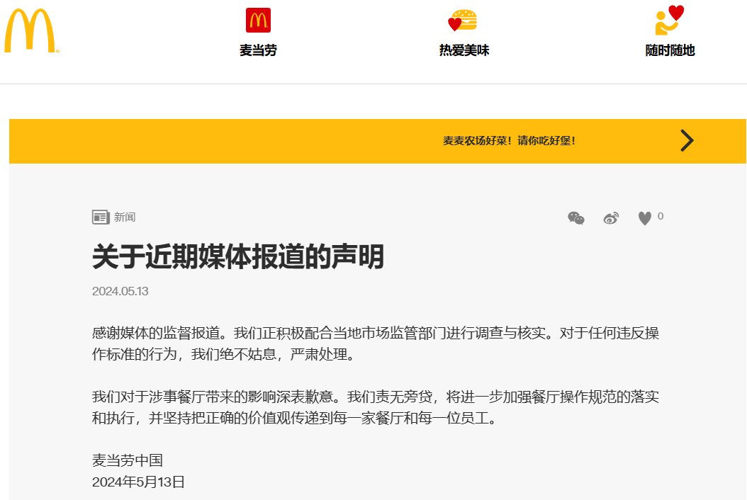 当晚,麦当劳中国发布声明称:“感谢媒体的监督报道。我们正积极配合当地市场监管部门进行调查与核实。对于任何违反操作标准的行为,我们绝不姑息,严肃处理。我们对于涉事餐厅带来的影响深表歉意。我们责无旁贷,将进一步加强餐厅操作规范的落实和执行,并坚持把正确的价值观传递到每一家餐厅和每一位员工。”