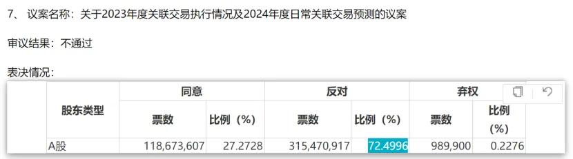 周一深夜,包钢股份发布了当日召开股东大会的结果。此次股东大会,其他议案都顺利通过,唯独一份《关于2023年度关联交易执行情况及2024年度日常关联交易预测的议案》被否,而且反对比例超72%。