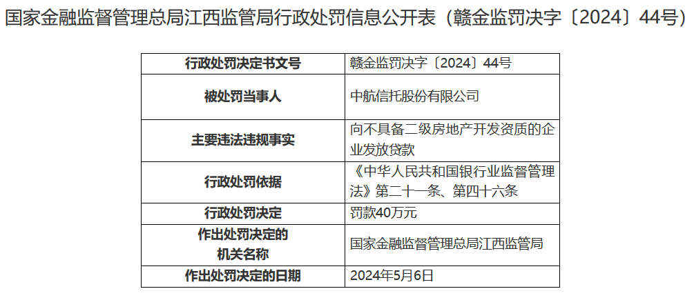 【大河财立方消息】5月13日,国家金融监督管理总局江西监管局披露的行政处罚信息公开表显示,中航信托股份有限公司因向不具备二级房地产开发资质的企业发放贷款,被罚款40万元。