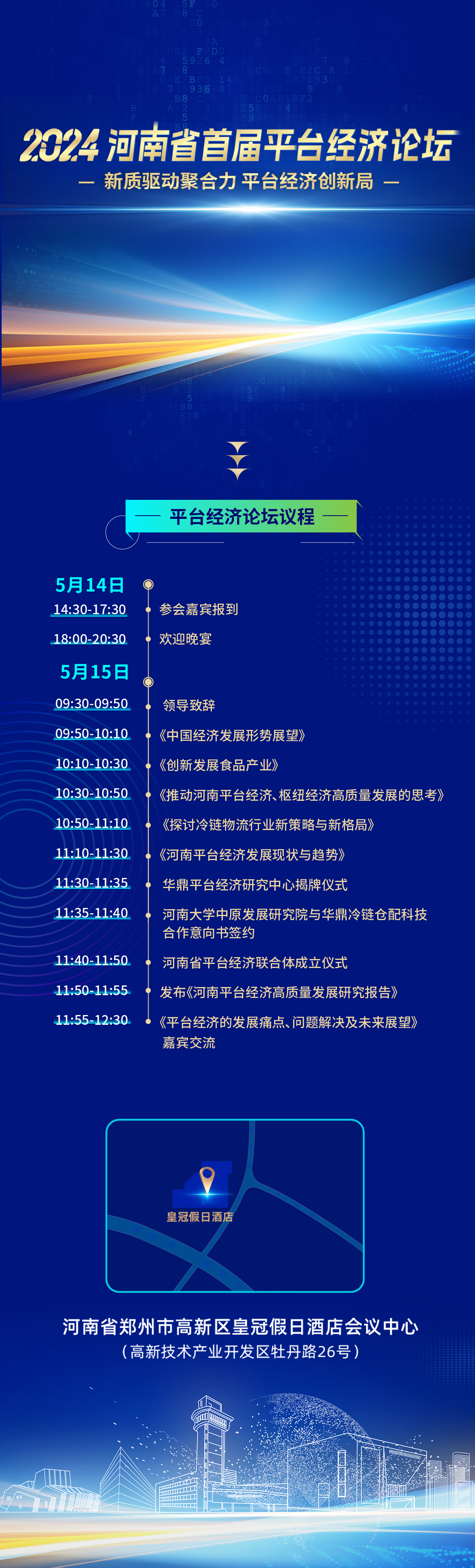 本届论坛上,河南大学中原发展研究院、郑州高新投资控股集团、华鼎冷链科技、UU跑腿、中钢网科技集团、哈哈出行、澄明食品产业园、锅圈食品(上海)股份、河南省数字产业创新中心、G7易流科技、千味央厨、酒便利等河南省内具有代表性的平台企业,还将举行河南省平台经济联合体成立仪式,共同推动河南平台经济规范健康持续发展。