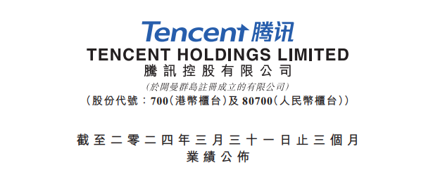 【大河财立方消息】5月14日,腾讯控股(0700.HK)发布公告称,第一季度营收1595.01亿元,同比增长6%;权益持有人应占盈利502.65亿元,同比增长54%。