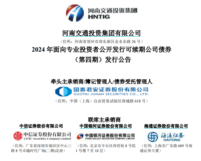 【大河财立方消息】5月15日,河南交通投资集团有限公司披露2024年面向专业投资者公开发行可续期公司债券(第四期)发行文件。