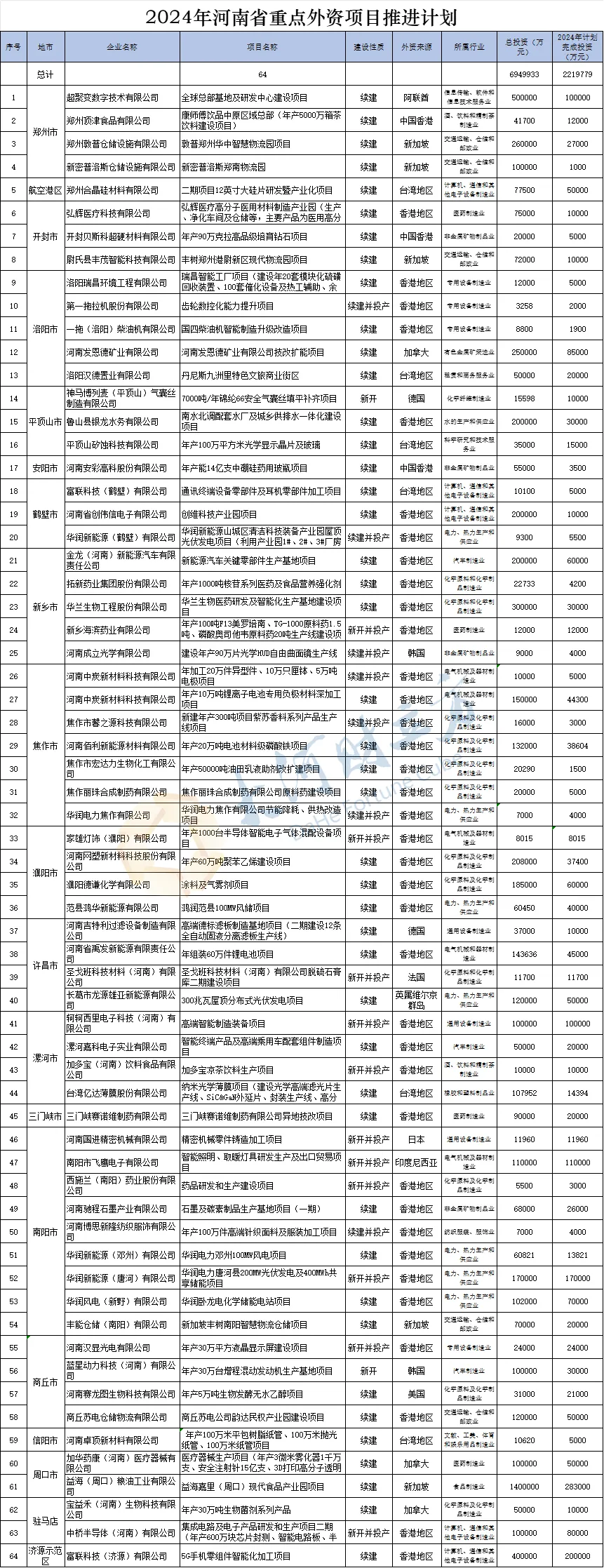 记者注意到,这64个重点外资项目分布在17个省辖市、济源示范区、郑州航空港区。其中,郑州市包括超聚变数字技术有限公司的全球总部基地及研发中心建设项目、郑州顶津食品有限公司的康师傅饮品中原区域总部(年产5000万箱茶饮料建设项目)等4个项目;郑州航空港区为郑州合晶硅材料有限公司的二期项目12英寸大硅片研发暨产业化项目,以上5个项目均为续建项目。