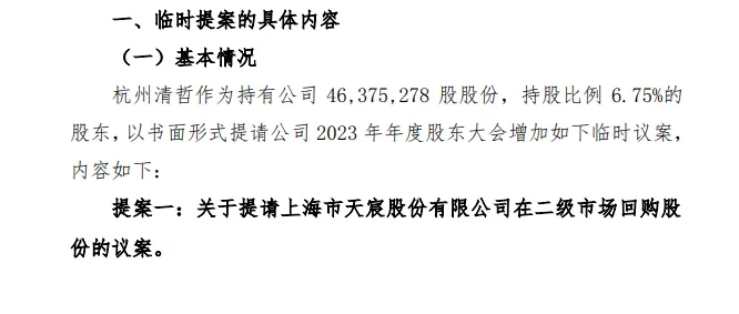 5月17日,杭州清哲投资管理有限公司—清哲和融7号私募证券投资基金(下称“杭州清哲”)向天宸股份提交2023年度股东大会临时提案。杭州清哲在临时提案中提出了两个要求,一是要求上市公司回购股份,二是要求上市公司明确转型计划和措施。