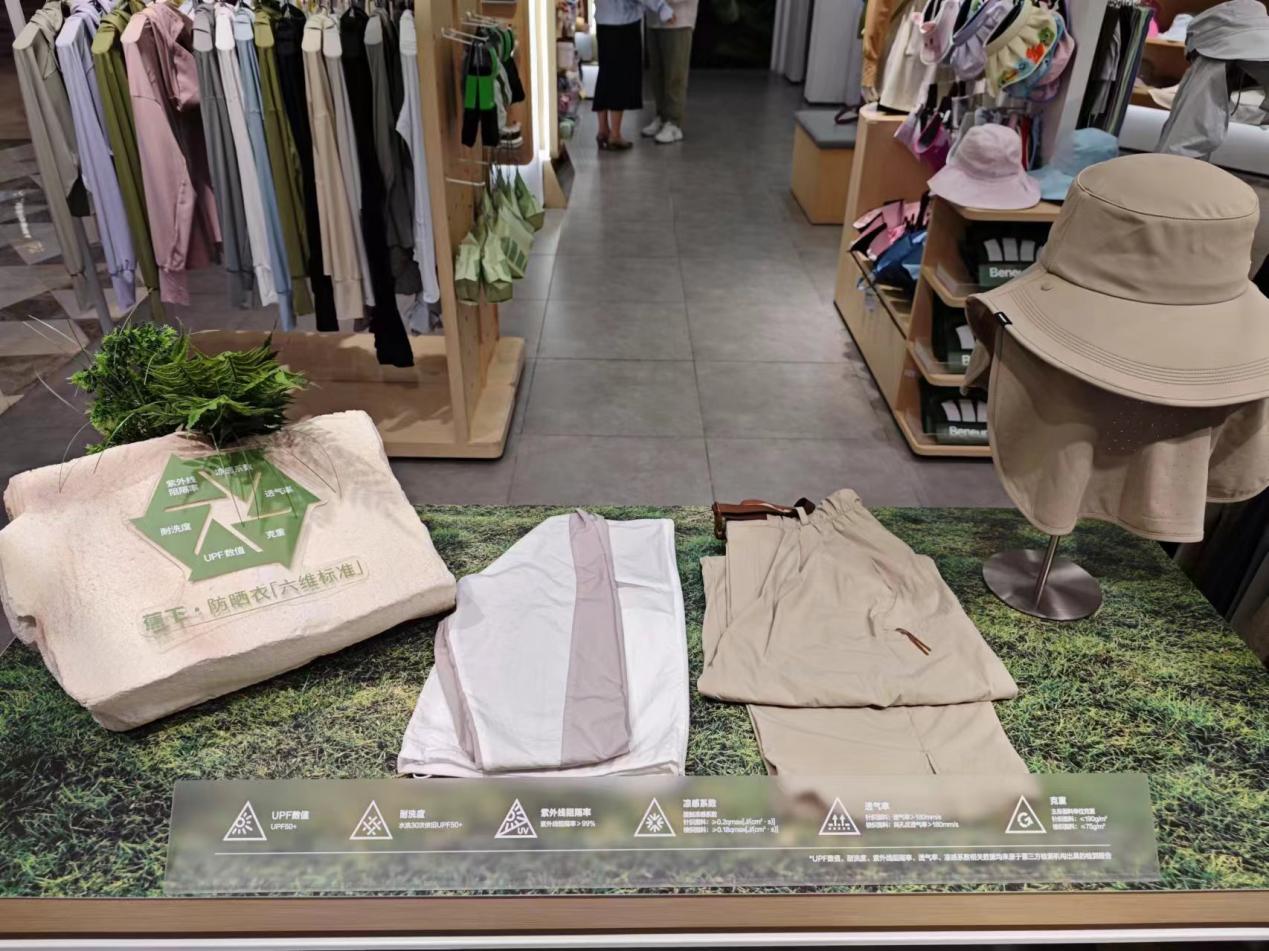 事实上,今年多家服饰品牌店均推出“捂得更严实”的防晒服,卖点各有不同。例如优衣库继续主打便携、舒适,女士、男士及儿童防晒衣,均突出“防晒·防水·便携”,速干衣也新增突出防晒功能;名创优品则主打“小蛮腰修身”“超透气小斗篷”;除了凉感、速干,骆驼徒步防晒衣还点出了“防蚊虫”。
