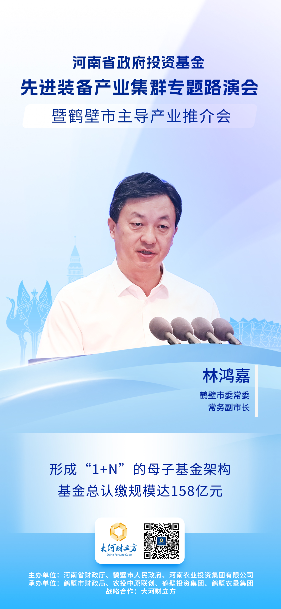 本次路演会以“政府基金引导 产业合作共赢”为主题,由河南省财政厅、鹤壁市人民政府、河南农业投资集团有限公司主办,鹤壁市财政局、农投中原联创、鹤壁投资集团、鹤壁农垦集团承办,大河财立方为战略合作单位。