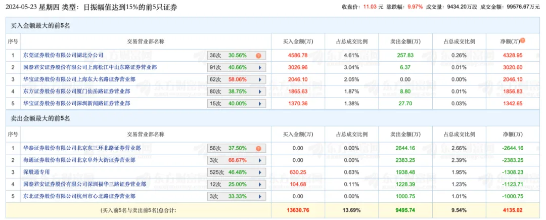 数据显示,今日买入前五的席位为东莞证券股份有限公司湖北分公司、国泰君安证券股份有限公司上海松江中山东路证券营业部、华宝证券股份有限公司上海东大名路证券营业部、东方证券股份有限公司厦门仙岳路证券营业部、华宝证券股份有限公司深圳新闻路证券营业部,买入金额分别为4586.78万元、3026.96万元、2046.1万元、1865.63万元、1370.36万元。