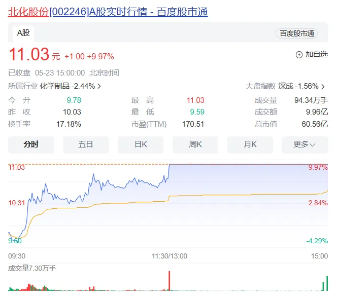 上述“调价函”在网络流传后,5月23日午后开盘,北化股份直线拉升至涨停,报11.03元/股,总市值达60.56亿元。