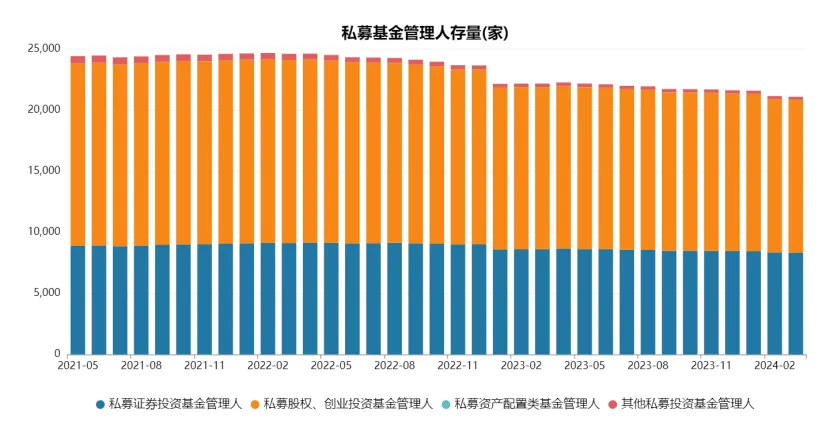 2022年2月,私募基金管理人存量达到24683家,为历史最高点。自此后,私募管理人的数量开始持续下滑。截至3月底,私募基金的管理人数量为21098家,较最高点大幅减少了3583家。其中私募证券基金管理人8328家,私募股权、创业投资管理人12526家,私募资产配置类管理人9家,其他类私募管理人235家。