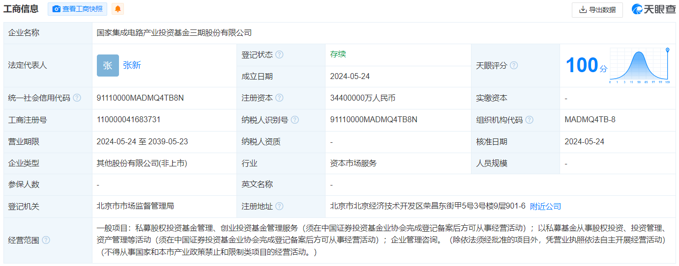 【大河财立方消息】5月27日消息,天眼查App显示,近日,国家集成电路产业投资基金三期股份有限公司成立,法定代表人为张新,注册资本3440亿人民币,经营范围为私募股权投资基金管理、创业投资基金管理服务,以私募基金从事股权投资、投资管理、资产管理等活动,企业管理咨询。