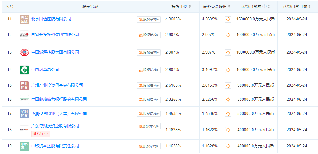 股东信息显示,该公司由财政部、国开金融有限责任公司、上海国盛(集团)有限公司、中国工商银行、中国建设银行、中国农业银行、中国银行等19位股东共同持股。