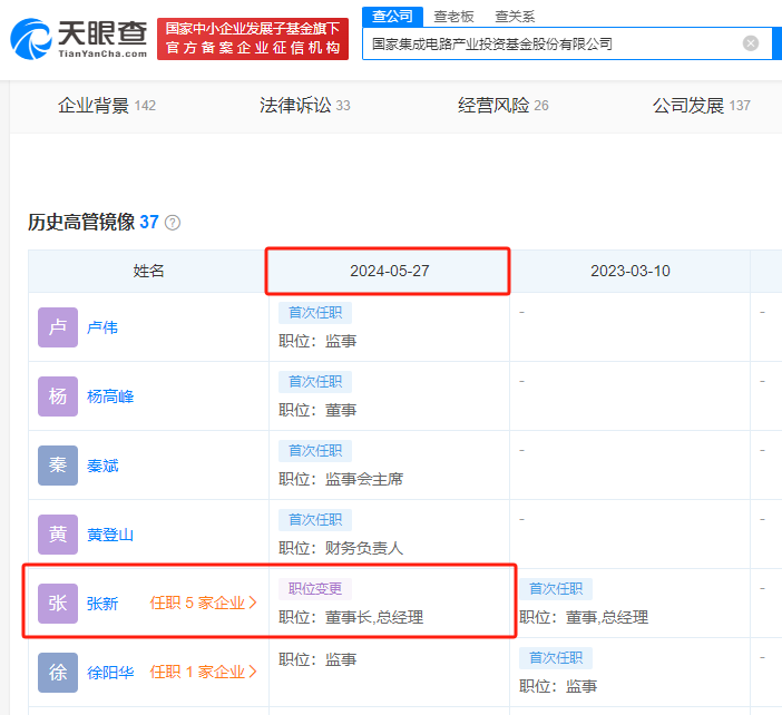 【大河财立方消息】天眼查显示,近日,国家集成电路产业投资基金股份有限公司、国家集成电路产业投资基金二期股份有限公司发生工商变更,楼宇光卸任两公司法定代表人、董事长,均由张新接任。