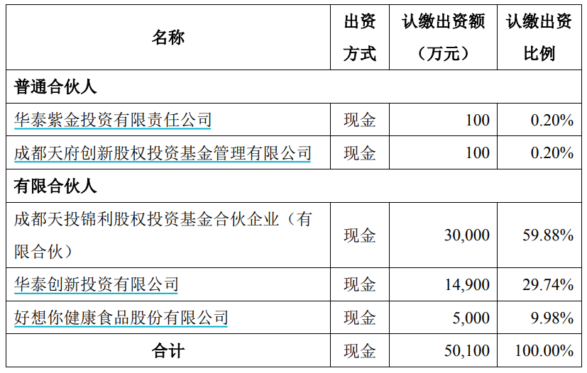 【大河财立方消息】5月27日,好想你公告,近日以自有资金认购成都华泰天府数智创业投资合伙企业(有限合伙)(以下简称:“天府数智基金”)基金份额。该基金规模5.01亿元,其中,好想你认缴出资5000万元,出资比例为9.98%。