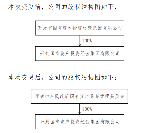 变更前,开封国投集团由开封市国有资本投资运营集团有限公司持股100%;变更后,开封国投集团控股股东为开封市人民政府国有资产监督管理委员会,持股比例为100%;本次变更后,开封国投集团实际控制人仍为开封市人民政府。