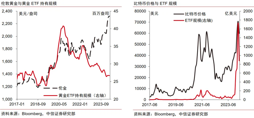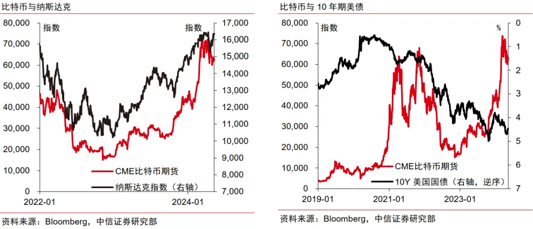 第三,相对黄金,比特币供给减半及需求增长的带动下行情或好于黄金。结合过往历史经验,比特币减半后往往出现持续的牛市行情,比特币ETF发售规模的持续扩大为市场带来更多增量资金。后续仍需关注其他地区对比特币监管的变化对增量资金和风险情绪的影响。