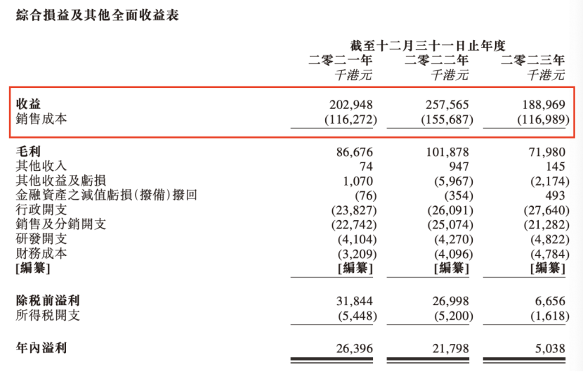 从其收益情况来看,2021年至2013年,公司营收分别为2.03亿港元、2.58亿港元及1.90亿港元,毛利则分别为0.87亿港元、1.02亿港元、0.72亿港元。其中2023年公司营收与毛利明显下滑,对此优博控股表示,因去年半导体行业暂时放缓,公司托盘及托盘相关产品销量下滑,导致公司经营规模及产品开发计划需要调整。