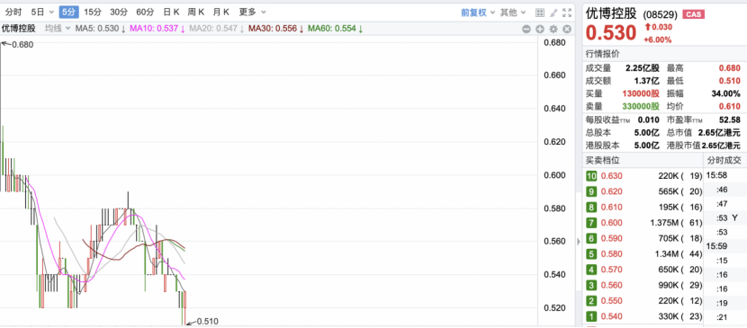 认购热情一度延续到优博控股上市,6月3日早盘,公司股价一度涨超30%,随后出现波动,截至发稿,股价上涨6%,报0.53港元/股,港股市值2.65亿港元。