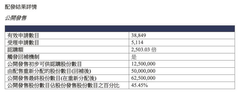 公开发售阶段,认购情况便异常火爆。据优博控股《最终发售价及配发公告》,公开发售部分,公司获得了2503.3倍认购额,最终股份数目(重新分配后)为6250万股,占到发售股份数目的45.45%。