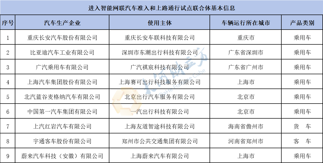 按照《关于开展智能网联汽车准入和上路通行试点工作的通知》(工信部联通装〔2023〕217号)有关工作安排,经汽车生产企业和使用主体组成联合体自愿申报、车辆拟运行城市人民政府同意、所在地省级主管部门审核推荐,工业和信息化部、公安部、住房城乡建设部、交通运输部四部门组织专家对首次集中申报的方案进行了初审和择优评审,研究确定宇通客车等9个进入试点的联合体。