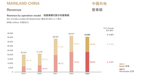 周大福2024财年中报中提到,内地的所有店铺当中有近乎一半是过去两年开设的。截至2023年9月30日,周大福加盟零售点位5734个,此类加盟零售点占内地店铺数目的77%,营业额占内地批发营业额约63%。