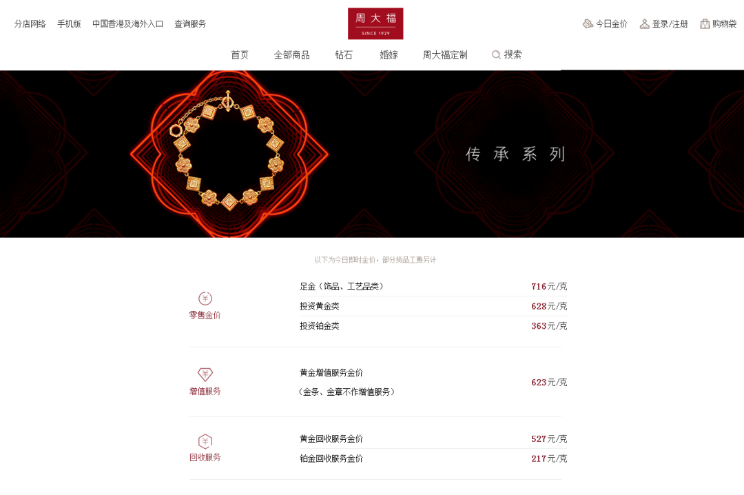 黄金价格的上涨再叠加本就不菲的门店加工费,周大福等金店的产品价格更是高不可攀。周大福官网显示,今日零售金价为716元/克。