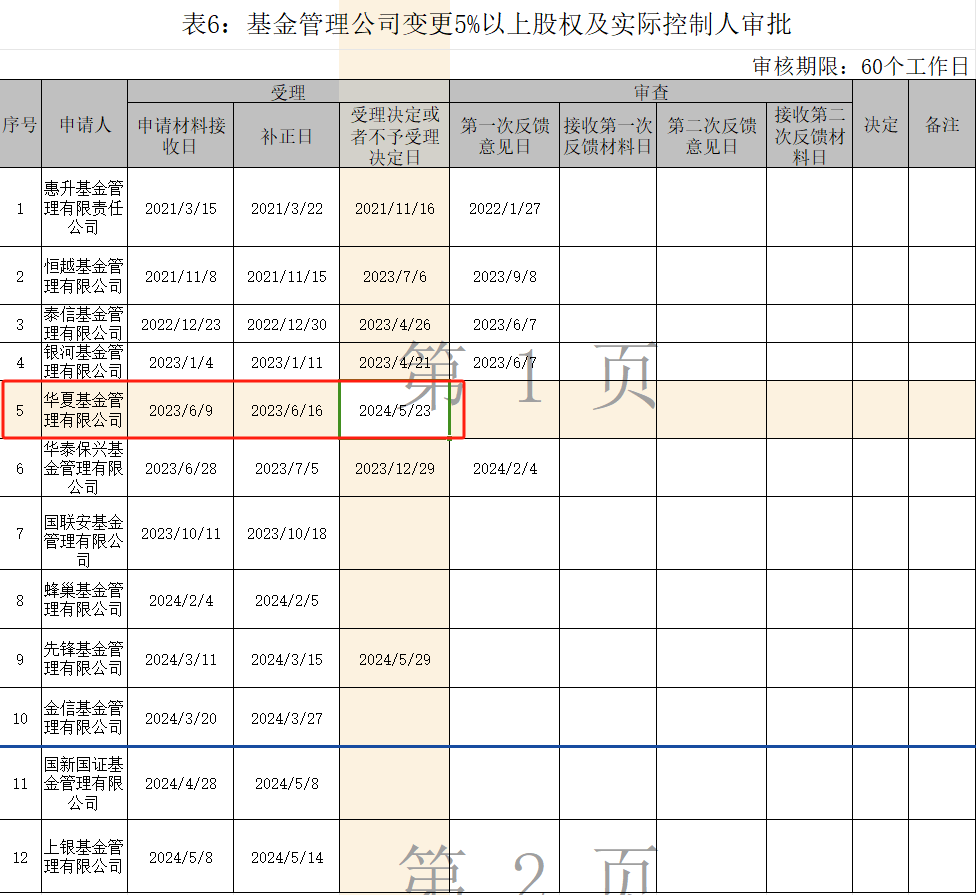 证监会数据显示,在截至5月底的基金管理公司变更5%以上股权及实际控制人审批表中,华夏基金也在其中,受理日为5月23日,审核期限一般为60个工作日。