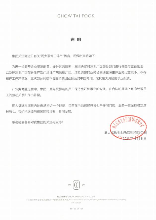 声明中提到,周大福集团决定把深圳厂区部分生产部门迁往广东顺德厂区。上述人士表示,此次深圳工厂涉及调整的业务占周大福集团在深主体业务比重较小,不存在停工停产情况,也不会影响集团业务及对中国内地,尤其是大湾区的长远投资。