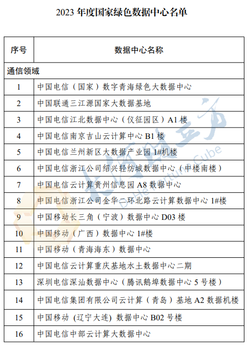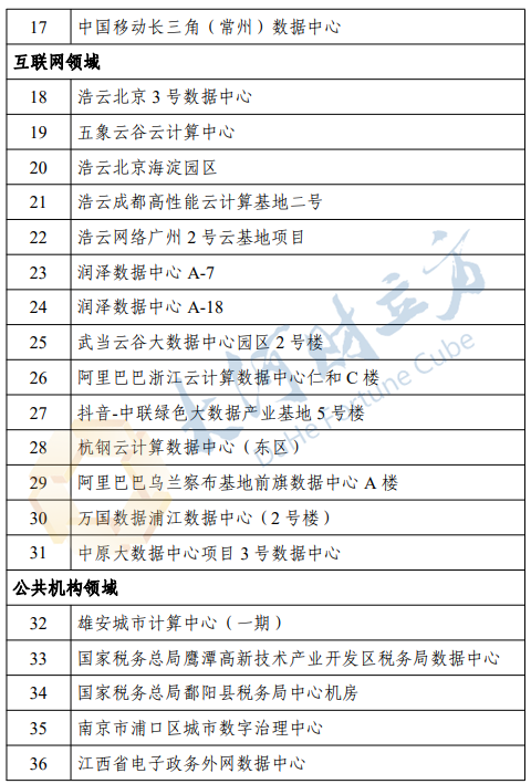 名单显示,国家绿色数据中心涉及六大领域,包括通讯领域17家、互联网领域14家、公共机构领域11家、能源领域1家、金融领域6家、智算中心领域1家。