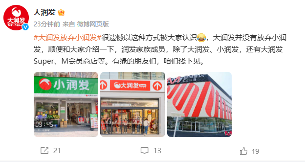 【大河财立方消息】6月6日,就市场传言的大润发将放弃社区超市品牌小润发一事,大润发在社交媒体发文表示并没有放弃小润发。此外,大润发还称:“润发家族成员,除了大润发、小润发,还有大润发Super、M会员商店等。”