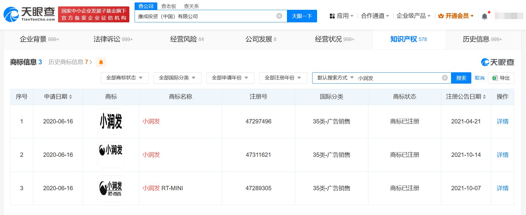 天眼查App显示,大润发关联公司康成投资(中国)有限公司曾申请注册多枚“小润发”“中润发”商标,国际分类均为广告销售,其中多数商标已成功注册。