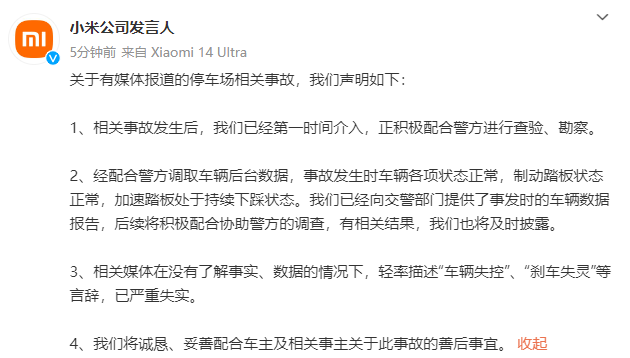 【大河财立方消息】6月7日,“小米公司发言人”微博发布关于有媒体报道的停车场相关事故的声明。