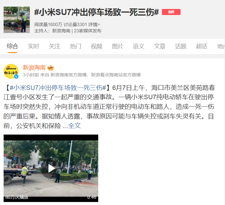 此前,有媒体报道,6月7日上午,海口市美兰区美苑路春江壹号小区发生了一起严重的交通事故。一辆小米SU7纯电动轿车在驶出停车场时突然失控,冲向非机动车道正常行驶的电动车和路人。