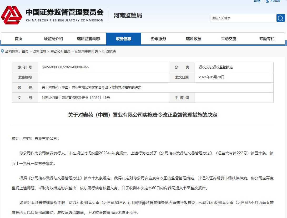 河南证监局决定对鑫苑置业实施责令改正的监督管理措施,并记入证券期货市场诚信档案。鑫苑置业应高度重视上述问题,采取有效措施切实整改,依法履行信息披露义务,并于收到本决定书60日内向河南证监局提交书面整改报告。