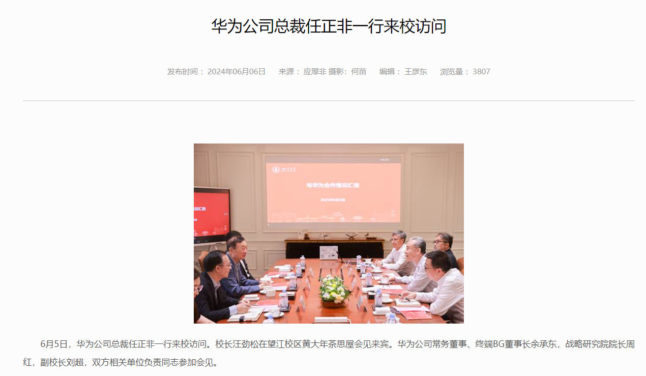 【大河财立方消息】6月8日消息,据四川大学官网,6月5日,华为公司总裁任正非一行到访四川大学。