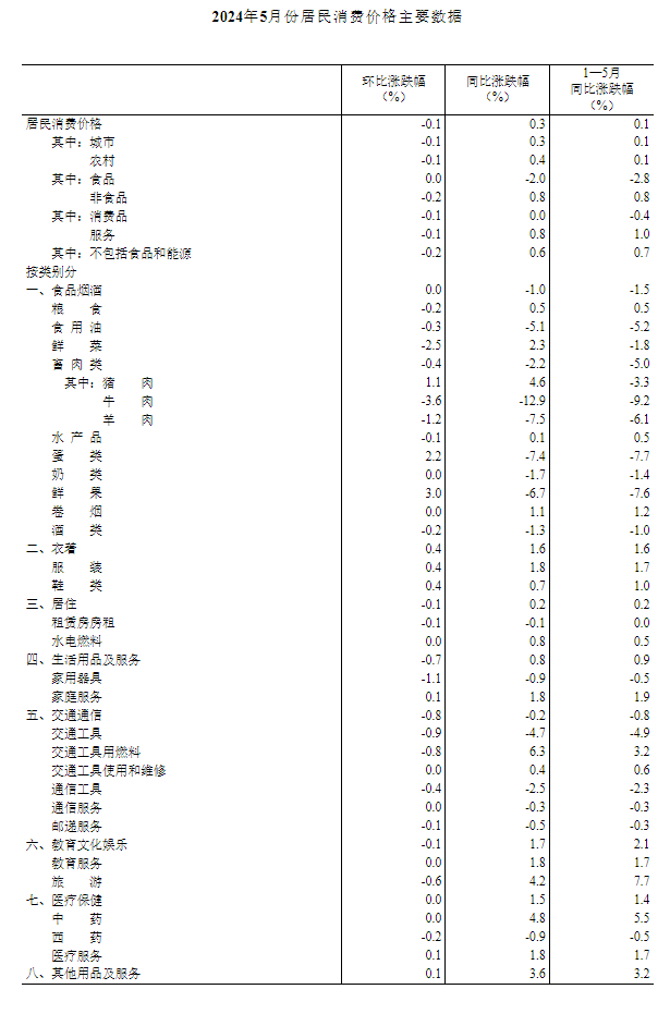 5月份,全国居民消费价格环比下降0.1%。其中,城市下降0.1%,农村下降0.1%;食品价格持平,非食品价格下降0.2%;消费品价格下降0.1%,服务价格下降0.1%。