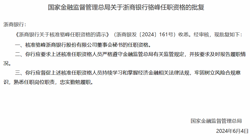 【大河财立方消息】6月13日消息,国家金融监督管理总局发布关于浙商银行骆峰任职资格的批复,核准骆峰浙商银行股份有限公司董事会秘书的任职资格。