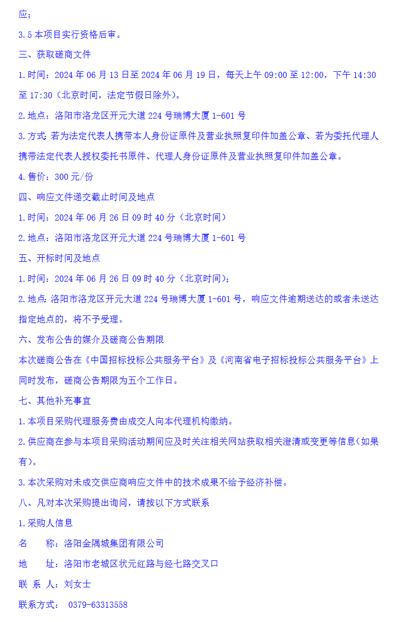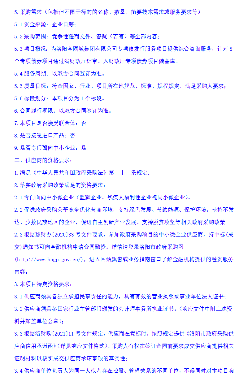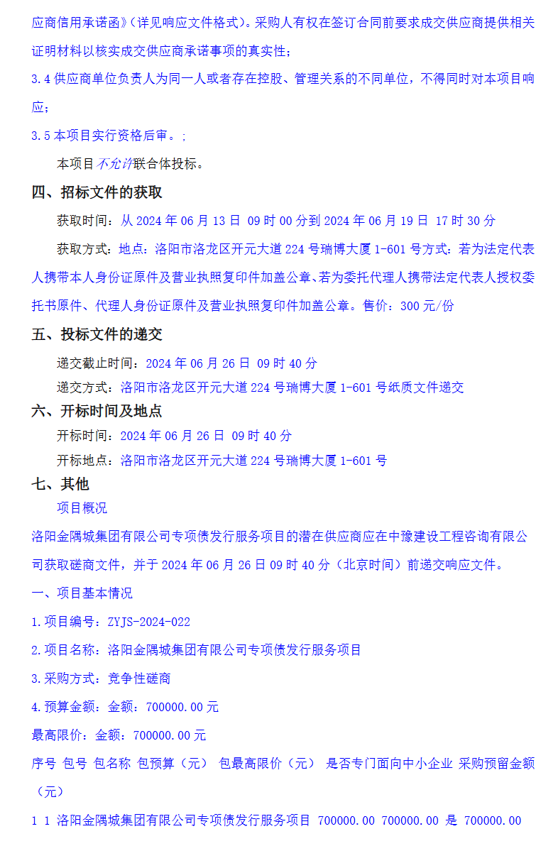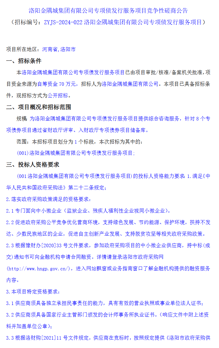 【大河财立方消息】6月13日消息,洛阳金隅城集团公告,就专项债发行服务项目竞争性磋商。