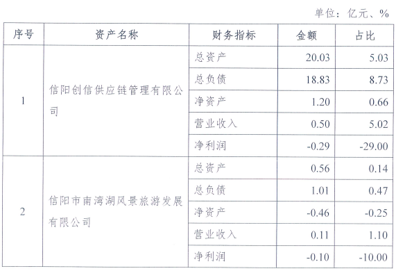 信阳华信投资集团称,信阳创信供应链管理有限公司、信阳市南湾湖风景旅游发展有限公司非本公司重要子公司,且信阳市南湾湖风景旅游发展有限公司连续多年亏损,导致净资产为负,存在较大信用风险。股权优化调整之后有利于促进集团体系内部业务板块间联动协同,进一步剔除低质低效资产,提升本公司经营能力及抗风险能力。新纳入的信阳茗祥园区管理有限公司对公司资产及业务形成有效补充。